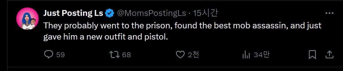 ' 아마도 그들은 감옥에서 최고의 폭력단 암살자를 찾아서 걔한테 새옷과 총을 줬을거야 '