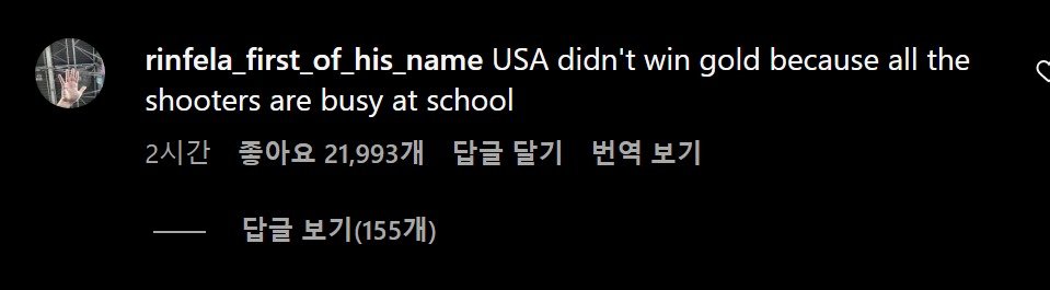 ' 미국이 금메달을 못딴 이유는 모든 사격선수들이 학교에 다니느라 바빴기 때문이야 '
